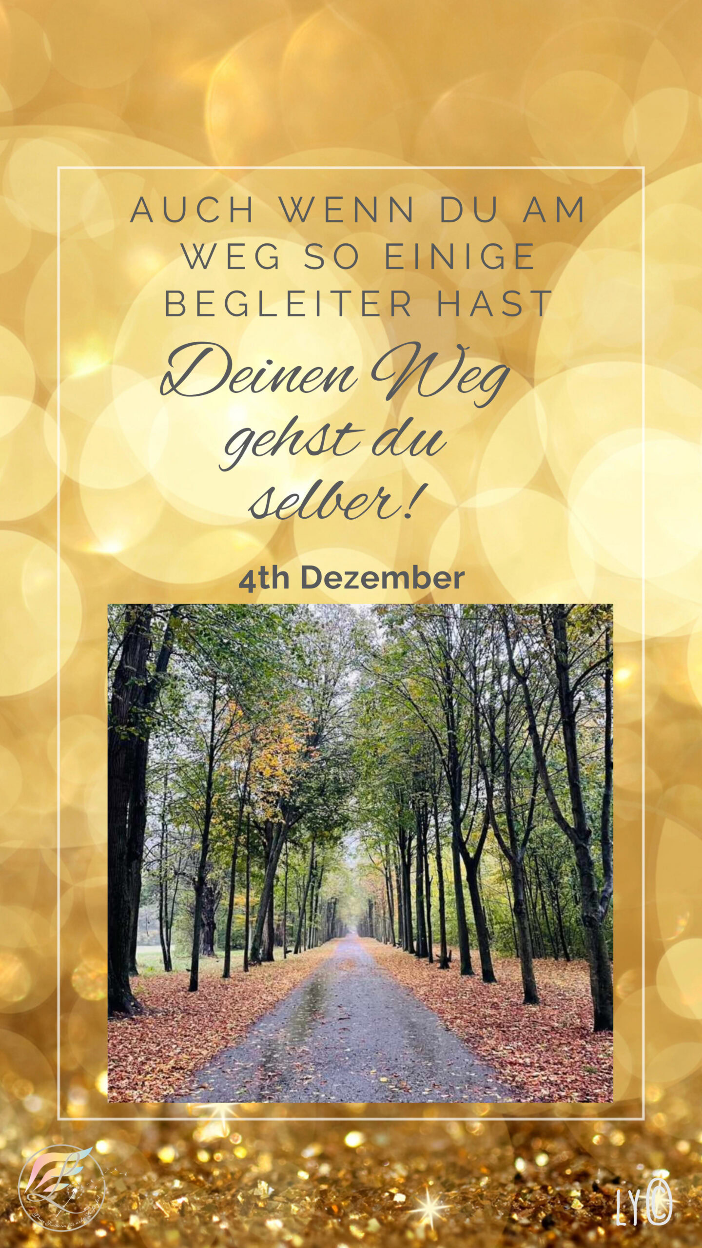 Manche Teilstrecken hast du mehrere Gefährten, manche Gefährten begleiten dich für längere Strecken. Und der eine oder andere verlässt dich um deinen Weg zu einem späteren Zeitpunkt wieder zu kreuzen. Wer immer bei dir ist, bist DU!