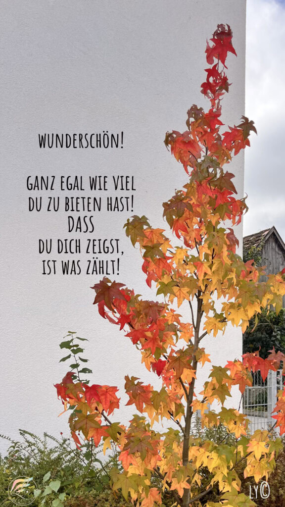 Wunderschön wie sich die Natur in diesen Tagen zeigt! Sie ist uns ein Vorbild in allen Bereichen. Der Wandel, die Veränderung ist wunderschön anzusehen. Dabei macht es keinen Unterschied wie groß oder mächtig das Blattwerk ist. Alle Blätter färben sich um! Jedes einzelne!